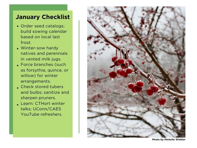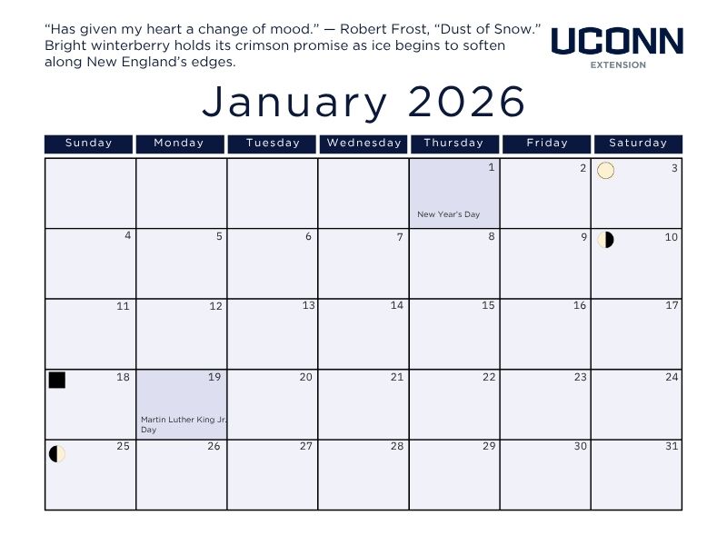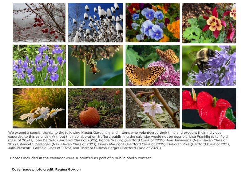 The UConn Master Gardeners have assembled a calendar for Connecticut gardeners! There are tips through every month on how to plan and maintain your garden for fresh blooms and abundant vegetables. This year there is additional information on supporting beneficial insects in the landscape, with tips on using integrated pest management, creating habitat for beneficials, and starting native plants by seed in the winter. All photos were submitted by local gardeners and selected by MG Volunteers during a statewide photo contest. MG Volunteers guided the design, information, and topics of this years calendar. We thank them for their work! 36 pages plus cover. 8.5in x 11in. Folded calendar.
